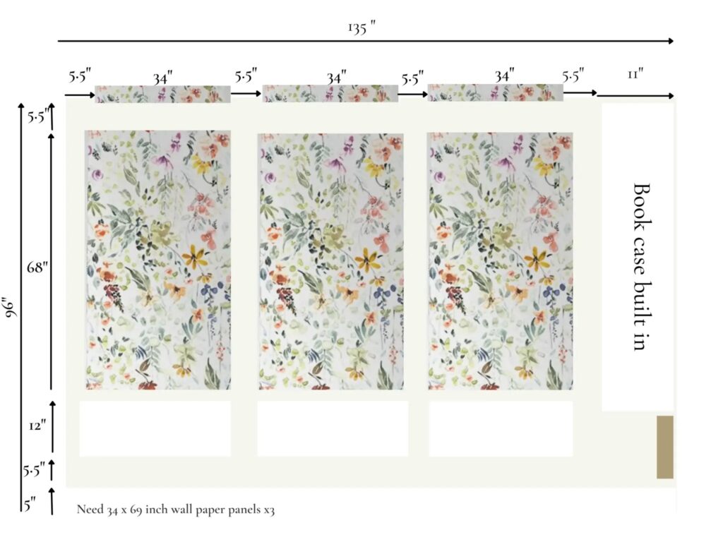 Determine how many panels you want to have for your accent wall, so you know how much wallpaper to order. I ordered 3 panels, and ensured the length was long enough to cover about ~¾ the length of the wall. For reference, my ceilings are 8 feet and I ordered 3 panels (each panel measured 34″width x 69″length)