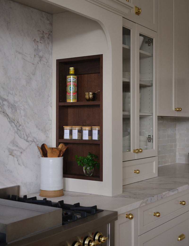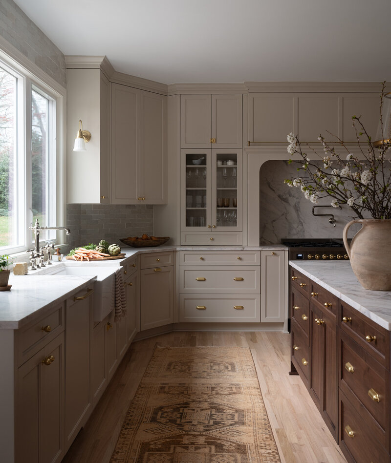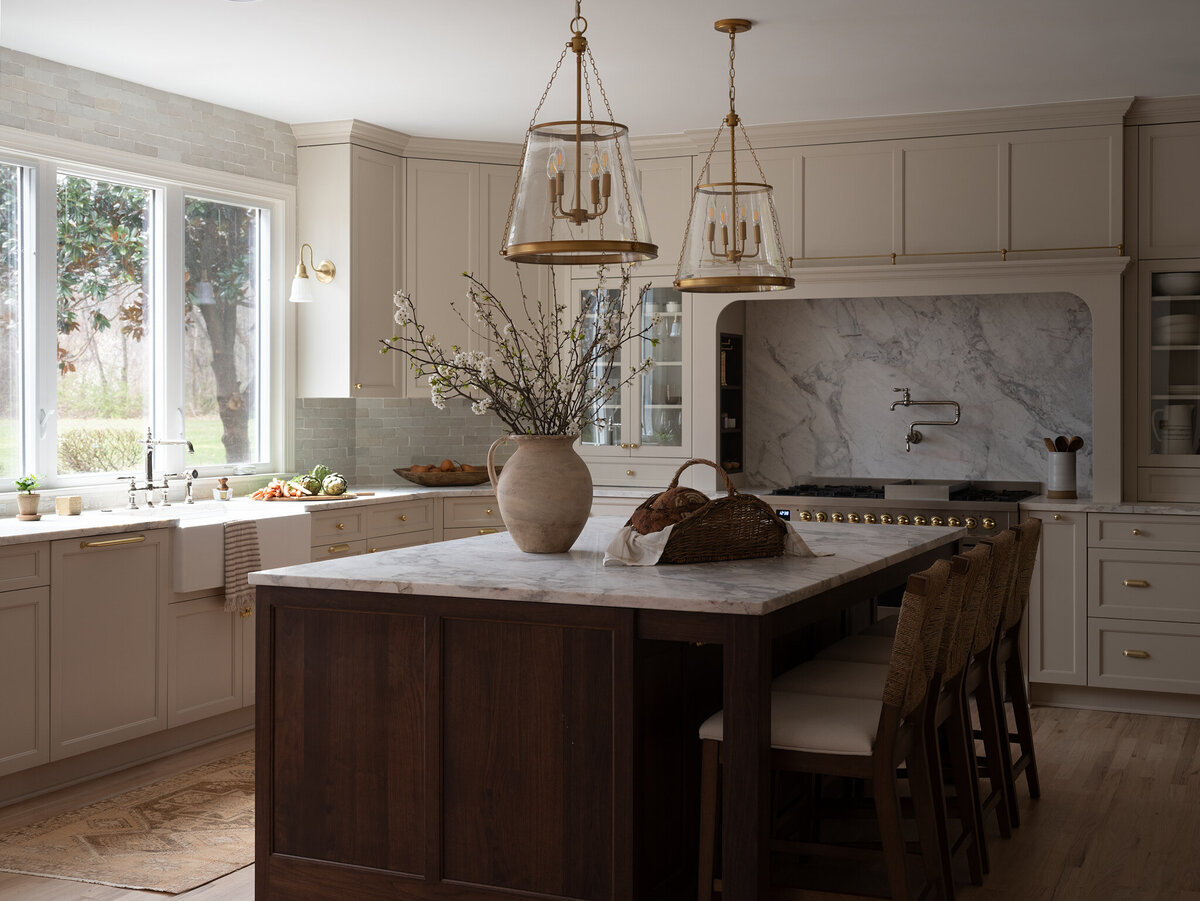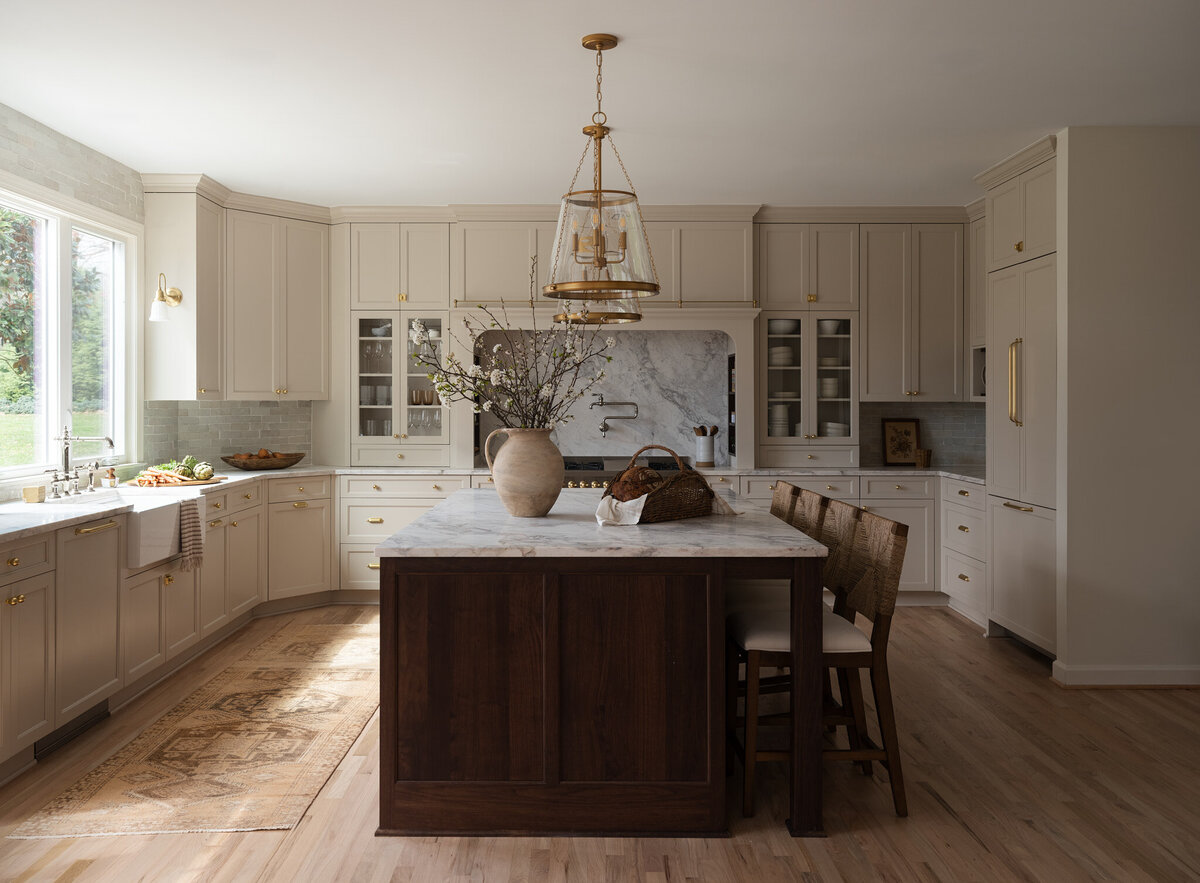 Located in Aldie Virginia, our Sousa Place kitchen project channels a Nancy Meyers-inspired sense of charm — layered and classic with rich walnut accents and a statement alcove hood as its centerpiece.