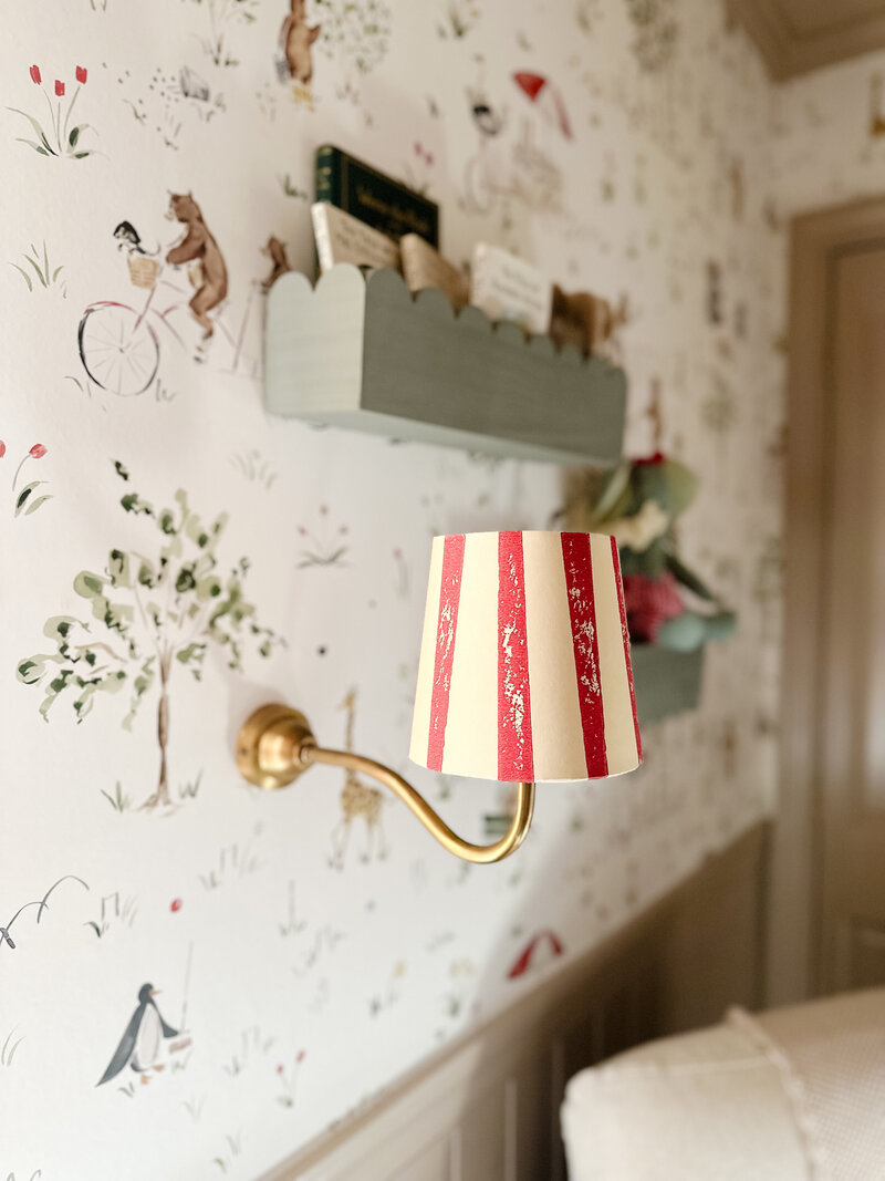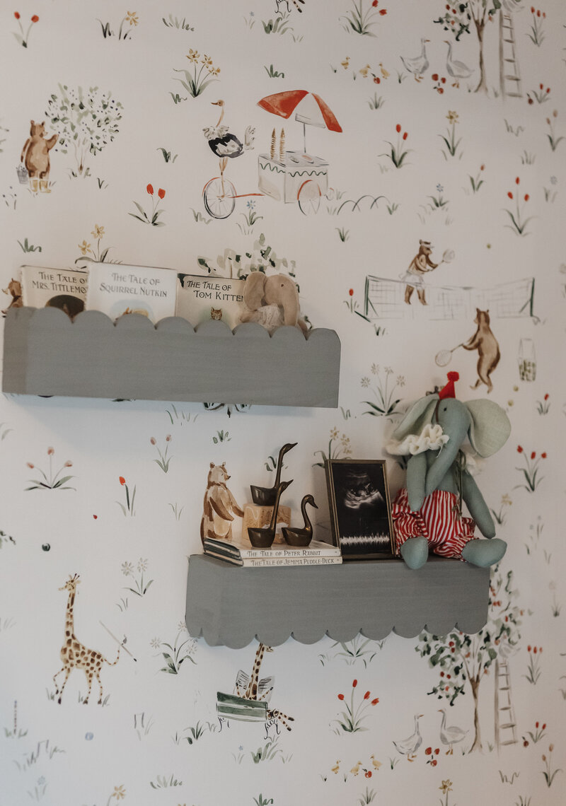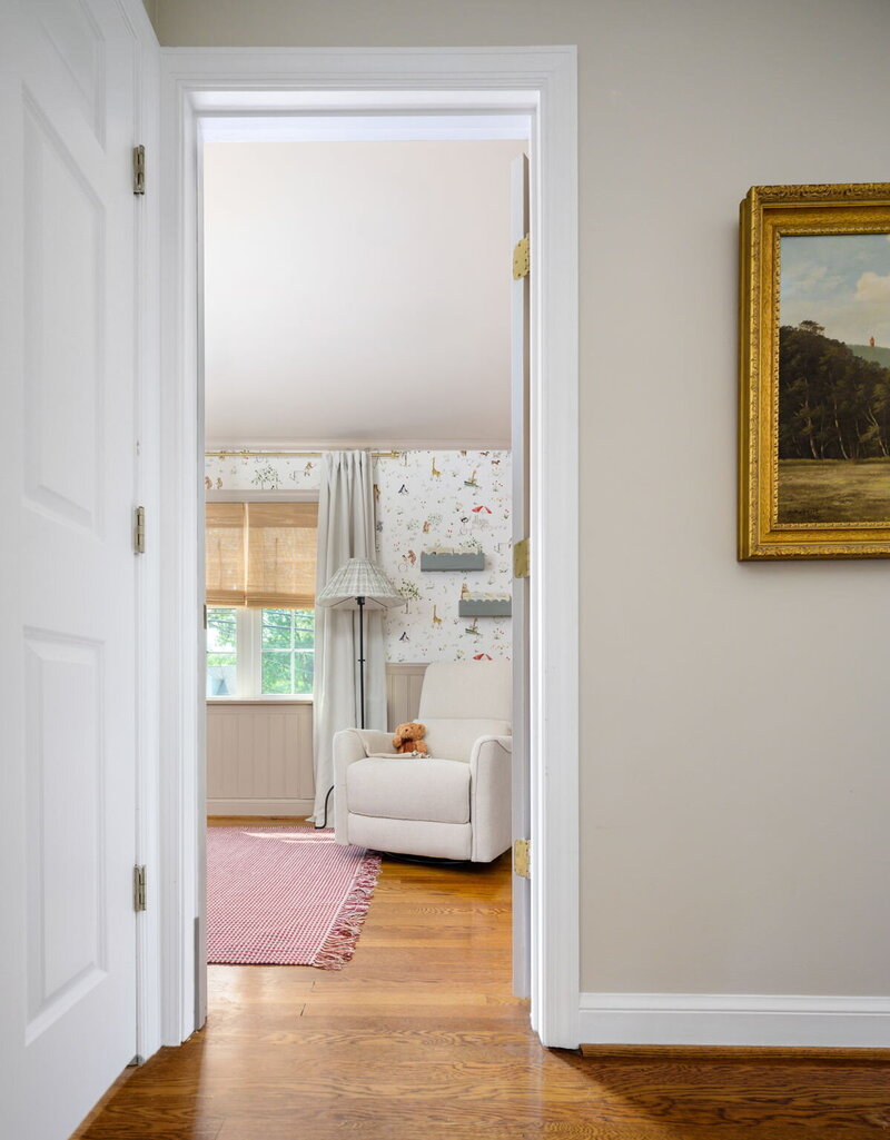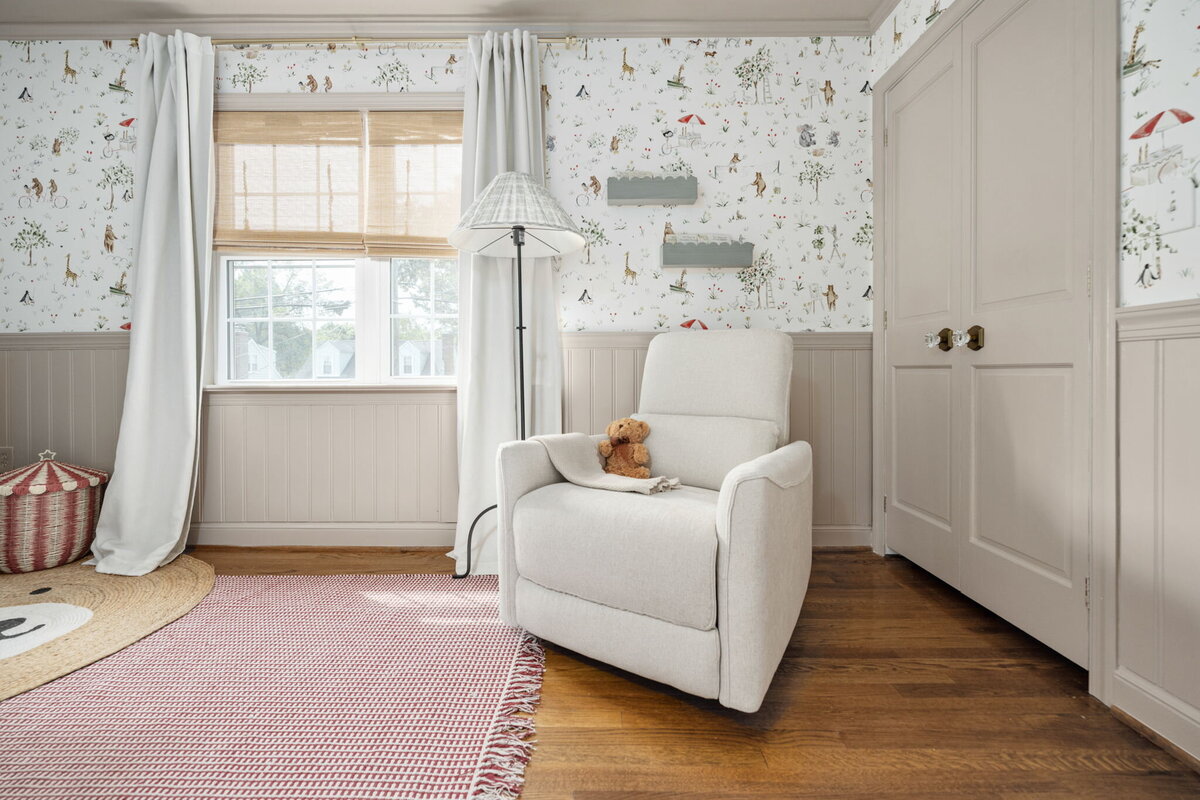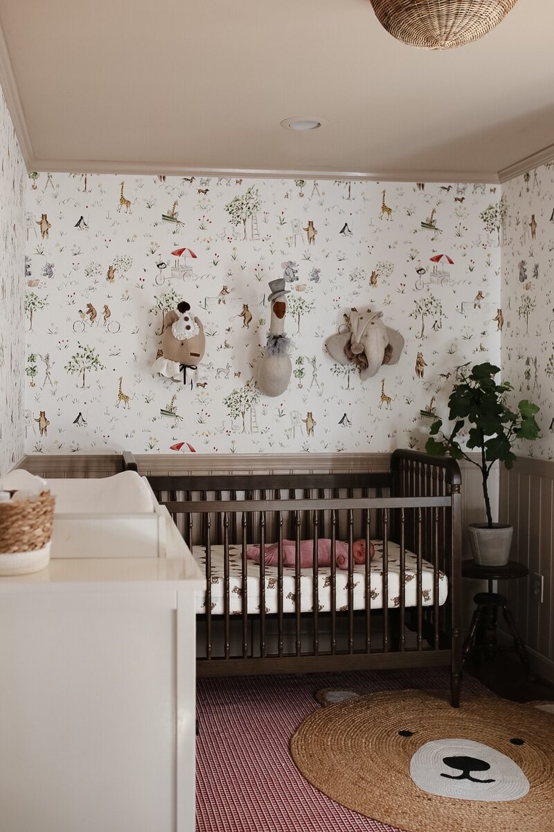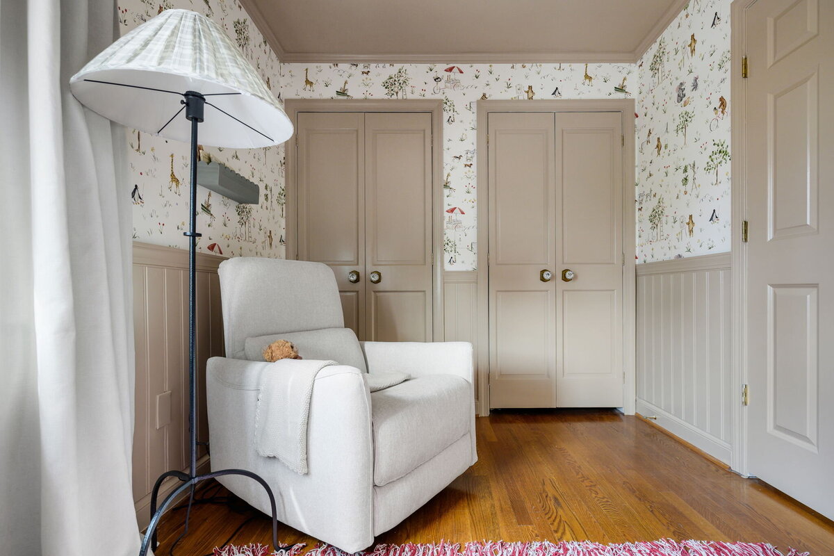 Designed for my youngest daughter, this Arlington nursery is a playful take on vintage-inspired design — centered around Riley Sheehey’s whimsical animal wallpaper and filled with sweet touches like party hat–wearing creatures and bear-themed details throughout. The result is a soft, storybook space that feels imaginative, cozy, and full of charm.
